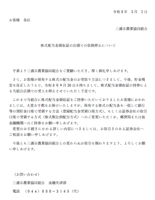 株式配当金領収証の店頭での取扱停止について
